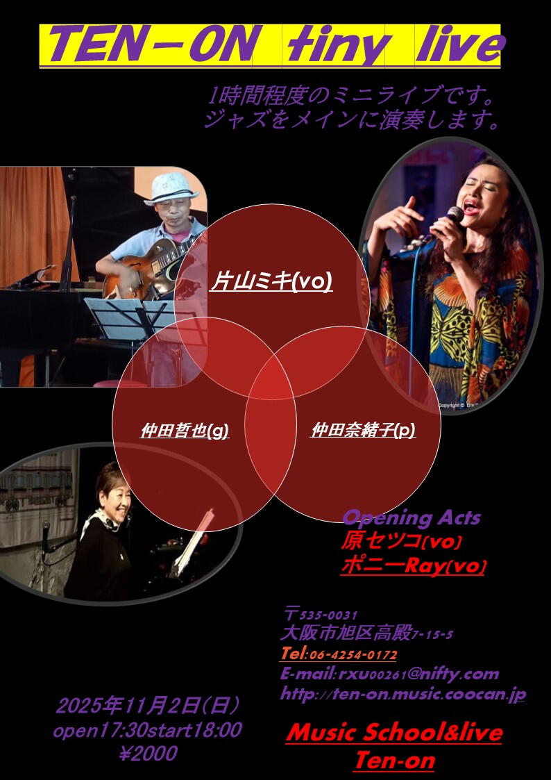 TEN−ON TYNY LIVE 片山ミキ(vo) 仲田奈緒子(p) 仲田哲也(g) パワーヴォーカリスト・片山ミキがジャズを歌います。1時間程度のミニライブです。 5:30open 6:00start \2000(予約不要です) |
